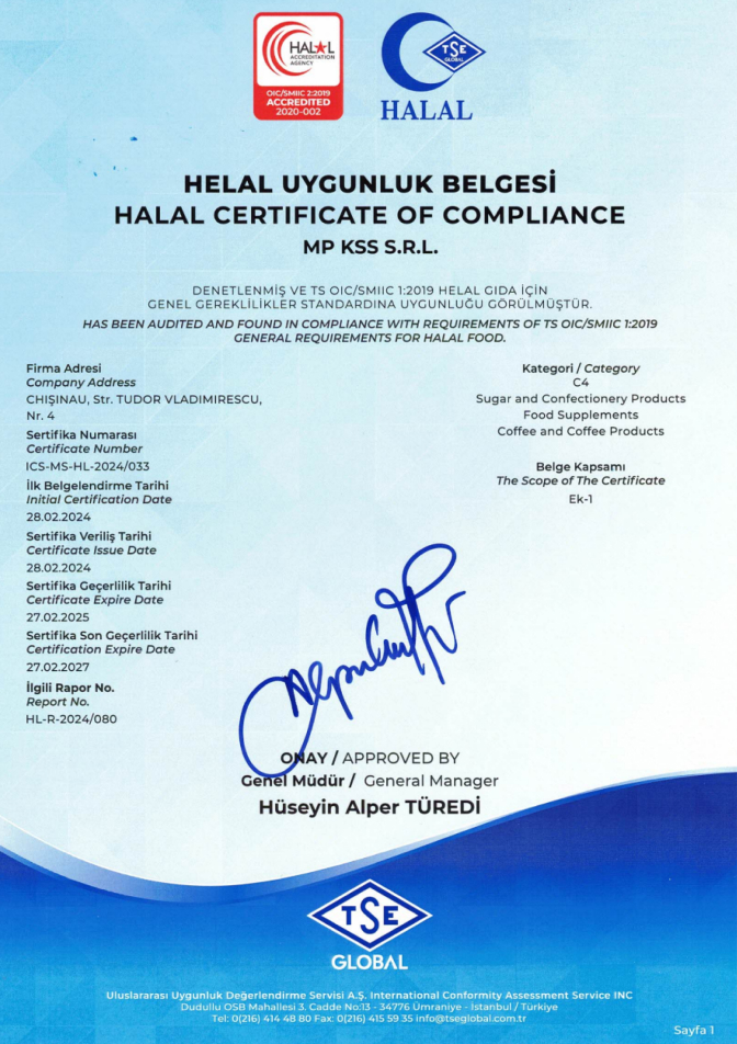 HALAL სერტიფიკატი ადასტურებს, რომ პროდუქტი დამზადებულია ისლამური იურისპრუდენციის მოთხოვნების შესაბამისად, რაც იმას ნიშნავს, რომ ის არ შეიცავს აკრძალულ ინგრედიენტებს.