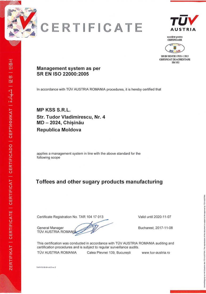 საწარმოში დანერგილი ხარისხისა და უსაფრთხოების მართვის სისტემა დამოწმებულია დამოუკიდებელი ევროპული სასერტიფიკატო ორგანიზაციის TUV Austria Group-ის მიერ.