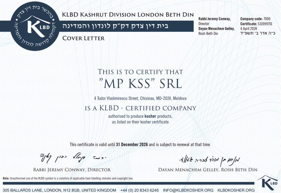 კომპანიის პროდუქცია დამტკიცებულია KLBD-ის მიერ კოშერის ლოგოს გამოყენების უფლებით მთელი წლის განმავლობაში.